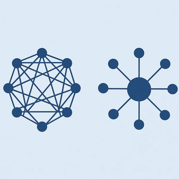 ▲ Left: full mesh communication — total connections = n(n-1)/2. As team size grows, communication cost grows exponentially. Right: hub-and-spoke model — total lines = n-1. Centralized roles or tools help reduce duplication and clarify responsibility.